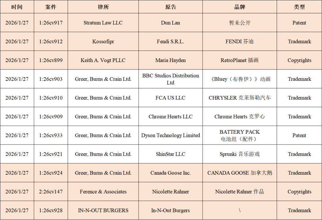 汇总案件编号: 26-cv-885 / 26-cv-933 / 26-cv-888 / 26-cv-890 / 26-cv-891 / 26-cv-912 / 26-cv-187 / 26-cv-899 / 26-cv-903 / 26-cv-910 / 26-cv-909 / 26-cv-917 / 26-cv-921 / 26-cv-924 / 26-cv-147 / 26-cv-928 起诉时间:1月26日 品牌:《Schitt’s Creek(富家穷路)》剧集 代理律所:Aronberg Goldgehn Davis & Garmisa 法院地:United States District Court, Illinois NorthernPranash 起诉时间:1月26日 品牌:《Grizzy and the Lemmings(熊鼠一家)》动画 代理律所:Aronberg Goldgehn Davis & Garmisa 法院地:United States District Court, Illinois NorthernPranash 本案系法国企业Hari Studios针对多名被告提起的版权侵权诉讼。 起诉时间:1月27日 品牌:RetroPlanet 插画 代理律所:Keith A. Vogt PLLC 法院地:United States District Court, Illinois NorthernPranash 起诉时间:1月27日 品牌:《Bluey(布鲁伊)》动画 代理律所:Greer, Burns & Crain Ltd. 法院地:United States District Court, Illinois NorthernPranash