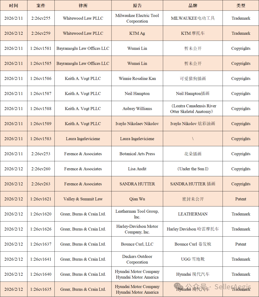 汇总案件编号: 26-cv-253 / 26-cv-255 / 26-cv-1581 / 26-cv-1583 / 26-cv-1585 / 26-cv-1586 / 26-cv-1587 / 26-cv-1588 / 26-cv-1589 / 26-cv-259 / 26-cv-260 / 26-cv-263 / 26-cv-1621 / 26-cv-1620 / 26-cv-1626 / 26-cv-1637 / 26-cv-1641 / 26-cv-1640 / 26-cv-1635 起诉时间:2月11日 品牌:花朵插画 代理律所:Ference & Associates 法院地:United States District Court, Illinois NorthernPranash 起诉时间:2月11日 品牌:MILWAUKEE电动工具 代理律所:Whitewood Law PLLC 法院地:United States District Court, Illinois NorthernPranash Milwaukee Electric Tool Corporation已就商标侵权问题对多名被告提起诉讼。 起诉时间:2月11日 品牌:可爱猫狗插画 代理律所:Keith A. Vogt PLLC 法院地:United States District Court, Illinois NorthernPranash 起诉时间:2月11日 品牌:Neil Hampton插画 代理律所:Keith A. Vogt PLLC 法院地:United States District Court, Illinois NorthernPranash 起诉时间:2月11日 品牌:Ivaylo Nikolov 炫彩油画 代理律所:Keith A. Vogt PLLC 法院地:United States District Court, Illinois NorthernPranash 起诉时间:2月12日 品牌:KTM 摩托车 代理律所:Whitewood Law PLLC 法院地:United States District Court, Illinois NorthernPranash 起诉时间:2月12日 品牌:《Under the Sun I》 代理律所:Ference & Associates 法院地:United States District Court, Illinois NorthernPranash 起诉时间:2月12日 品牌:SANDRA HUTTER 插画 代理律所:Ference & Associates 法院地:United States District Court, Illinois NorthernPranash