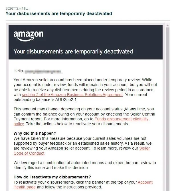 该卖家账户于2026年2月11日收到亚马逊的账户临时审查通知,以近期销量与历史销量存在明显差异为由,对该账户启动审查,并冻结其资金。