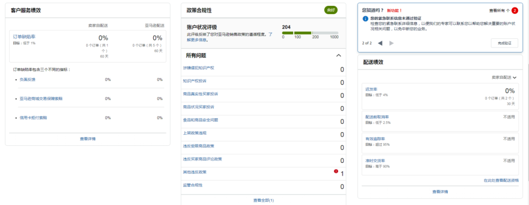接单后,SellerAegis/卖家守护第一时间核查了账户状况页面:账户整体状态良好,账户评级分数204分,1个违反政策记录。