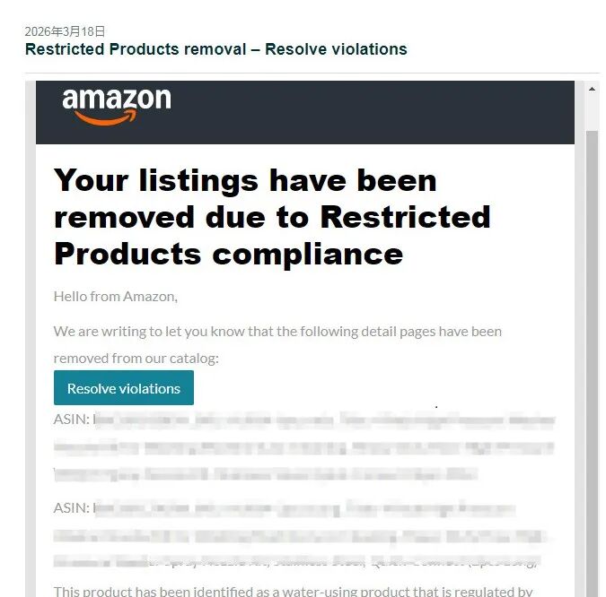 SellerAegis/卖家守护就此次问题与卖家进行深度沟通及情况核实后获悉:该商品属于用水产品,根据相关要求需在销售前完成合规贴标与注册。由于卖家对平台受限商品政策不熟悉,未能提前完成相关合规流程,导致出现违规行为,进而触发亚马逊违规警告。