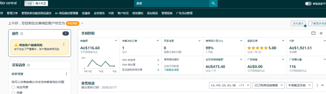 该卖家于2024年10月注册并开始运营亚马逊澳大利亚站,采用FBM发货的运营模式,店铺所有商品均为自主创建的Listing,账户资金为AU$1,921。