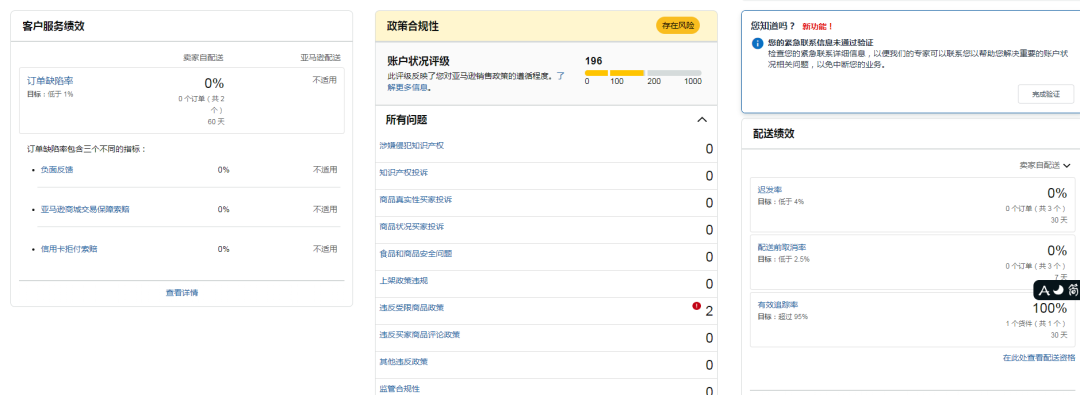 接到订单后,SellerAegis/卖家守护立即启动账户状况专项核查工作。核查结果显示,该账户当前处于风险状态,评级分数196分。通过对政策合规记录模块核查,确认账户存在2条违规记录,经核实,违规原因为违反受限商品政策。