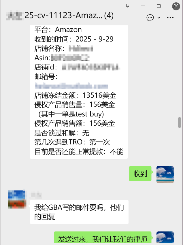 客户通过微信联系到SellerAegis卖家守护团队,表达希望参与“集体和解”的意愿。团队在收到客户信息后,迅速梳理案情:原告:Toyota Motor Sales, U.S.A., Inc.代理律所:GBC(Greer, Burns & Crain)实际销售额:156美金状态:已缺席判决,资金已被划扣