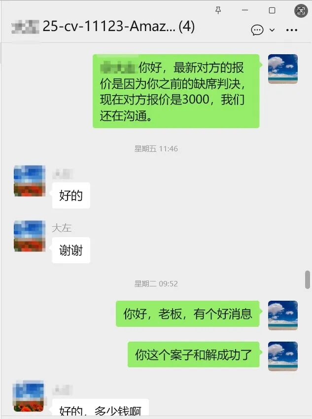 团队判断,虽然案件已进入缺席判决阶段且资金已被划扣,但客户销售金额极低,仍有谈判空间。关键在于:让原告确认划扣金额即为最终和解金,不再追加任何额外赔偿。SellerAegis卖家守护团队立即与GBC律所取得联系,提出客户销售金额仅156美金,虽然账户被划扣13,516美金,但实际侵权情节轻微。我方主张:·原告已通过缺席判决划扣账户全部余额,该金额应视为对本案的完全赔偿·我方愿以签署和解协议、承担律师费的方式,换取案件彻底了结。