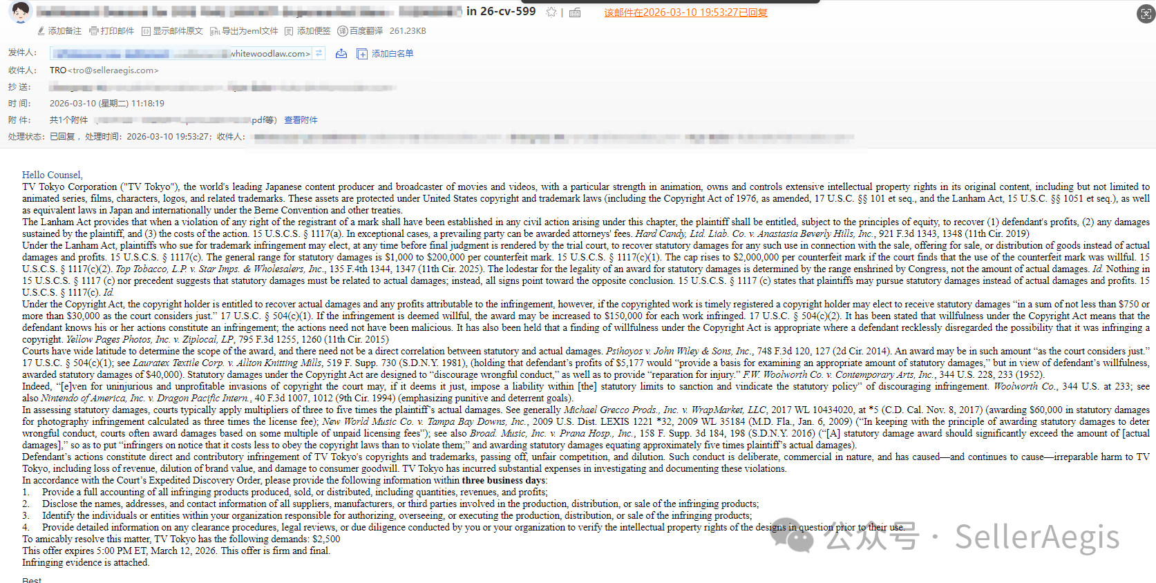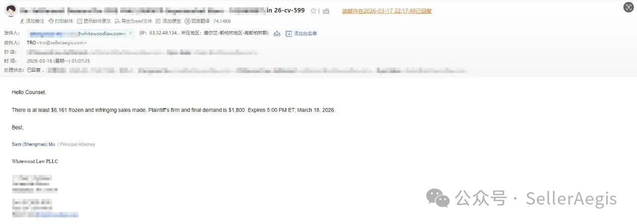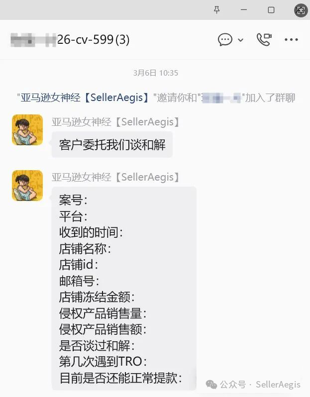客户通过微信联系到SellerAegis团队,提供了案件基本信息。团队迅速梳理案情:- 原告:TV Tokyo Corporation- 代理律所:Whitewood Law PLLC- 客户诉求:希望实现“划扣和解”