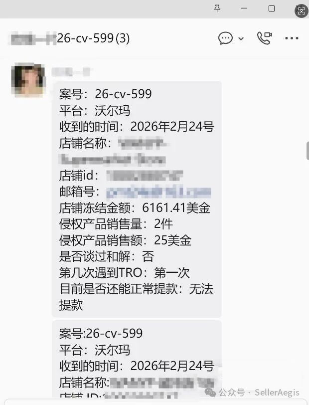2026年2月24日,沃尔玛卖家朋友收到TRO冻结通知,账户内6161.41美金被锁。原告为TV Tokyo Corporation(东京电视台),代理律所为Whitewood Law PLLC,案件涉及动漫火影忍者相关版权与商标侵权。客户实际销售额仅25美金,销售量仅2件,侵权情节轻微。但账户冻结金额较高,且客户对和解流程不熟悉,一度陷入焦虑。客户在TRO后主动联系到SellerAegis卖家守护团队,寻求专业介入。客户提出一个核心诉求:希望和解金由沃尔玛平台直接划扣,而非自行汇款,以减少操作风险和资金安全顾虑。