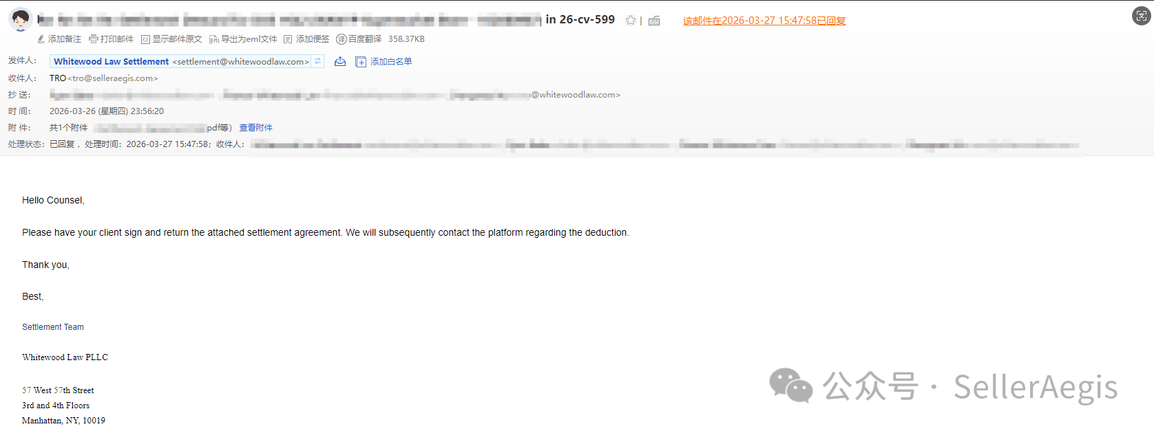 原告律所发来和解协议,但要求客户自行汇款至律所信托账户。团队立即与原告律所沟通,重新制定账户余额划扣来支付和解金的方式。经过多轮沟通,原告律所最终同意客户要求的划扣方案,并发来和解协议:协议明确:和解金1800美金,由沃尔玛平台直接划扣。🌟 3月27日:和解完成,客户满意: