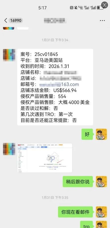 🔺 2026年1月31日:亚马逊卖家店铺收到美国法院发出的TRO,店铺资金被冻结566.94美金。卖家向SellerAegis卖家守护提供了初步信息:侵权产品历史销量554个,销售额约4000美金。