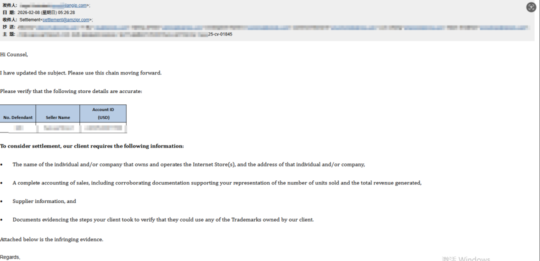 🔺 2026年1月31日:SellerAegis卖家守护接单后当天进行首轮谈判。🔺 2026年2月3日:Keith律所回复,称正在等待案件数据,双方保持高频沟通。🔺 2026年2月8日:Keith律所要求提供“店铺所有者信息”、“供应商信息”、“侵权证据”。