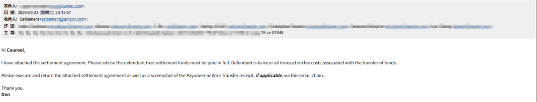 🔺 2026年3月24日(上午):SellerAegis卖家守护团队在与卖家确认后,立即以新的数据为基础重新展开谈判。🔺 2026年3月24日(当晚):Keith律所迅速回应,最终谈判和解金达成一致:7,500美金。