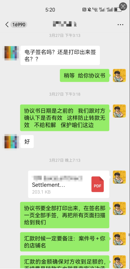 🔺 2026年3月27日:卖家签署和解协议书,团队手把手指导卖家完成和解金支付。