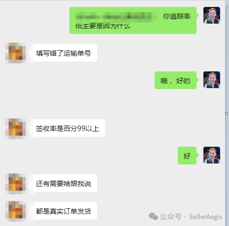 SellerAegis卖家守护与卖家深度沟通,核对订单物流底单及后台填报记录后确认:物流单号填写错误是追踪率异常的关键诱因。单号填报失误导致平台系统无法识别物流轨迹,最终判定该类目追踪率不达标,移除对应自发货权限。