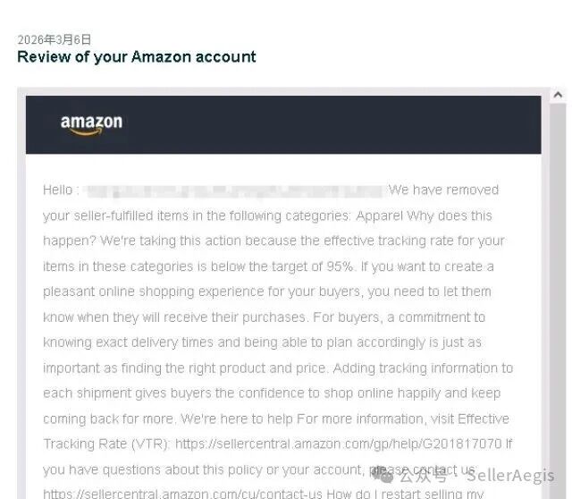 2026年3月6日,该卖家账户收到亚马逊业绩通知,因部分类目有效追踪率未达95%平台标准,对应类目自发货权限被平台移除。