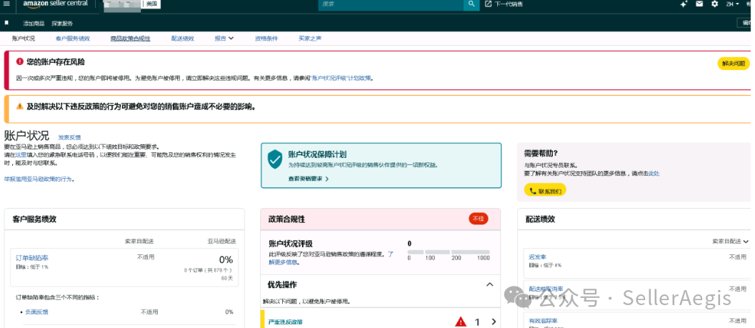 SellerAegis卖家守护接单后,第一时间查看账户状况,发现账户处于风险状态,评级分数已降为0分。进一步查看,违反买家商品评论政策违规为触发账户风险的直接原因,并已被标记为严重违规。