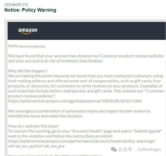 2025年6月17日,亚马逊判定卖家账户违反买家商品评论政策,向卖家发送政策警告,提示若问题未及时整改,将面临账户停用。本次警告由系统检测触发,核心原因为怀疑卖家存在干预商品评论的嫌疑。