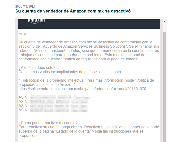 2026年3月8日,该卖家收到亚马逊业绩通知,其内容指出因其账户存在一项或多项知识产权政策违规,因此平台停用其账户。