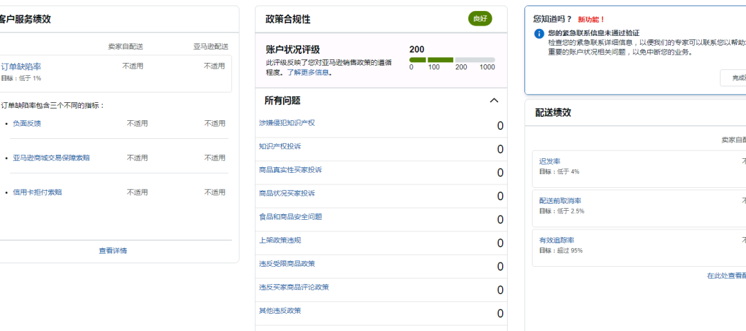 接单后,SellerAegis卖家守护第一时间核查账户状况页面,结果显示:账户已处于良好状态,评级分数为200分,无任何违规记录。结合亚马逊业绩通知的内容可明确判定,本次账户停用由侵权问题直接导致。